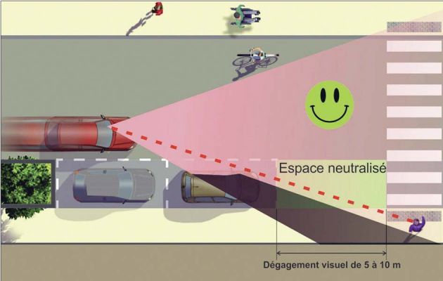 Objectif : améliorer la visibilité et la sécurité des piétons. Transcrite à l’article L118-5-1 du Code la voirie routière, cette obligation ne s’applique pas aux emplacements réservés aux vélos et aux engins de déplacement personnel (trottinettes, gyropodes) qui peuvent donc être aménagés dans cette zone de 5 mètres.